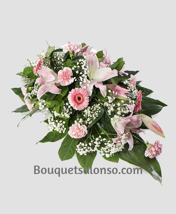 Especial y elegante este Centro Funerario Tonos Rosas. Es un centro de flores para tanatorio, de flores para difuntos variadas, en tonos naranjas, confeccionado con gerberas, claveles y paniculata y verdes variados que le dan al centro un toque dulce y delicado. Nuestros centros de flores para fallecido se envían a los Tanatorios como muestra de cariño, aprecio y acompañamiento para la familia de la persona fallecida.